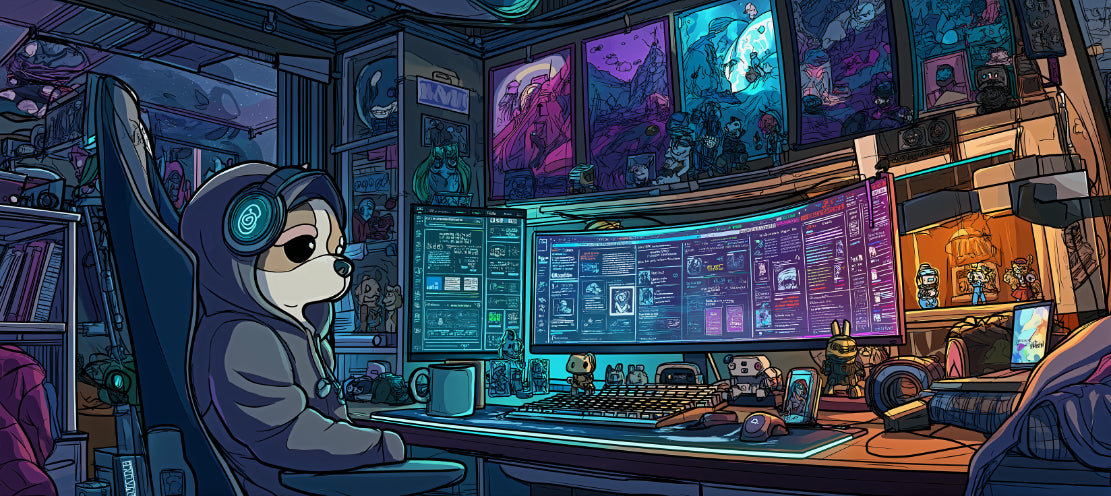 Transform your workspace into a cozy command center with this Lo-Fi Dog Gamer Mouse Pad – a vibrant, full-color desk mat featuring a hoodie-wearing pup immersed in a neon-lit streaming setup.