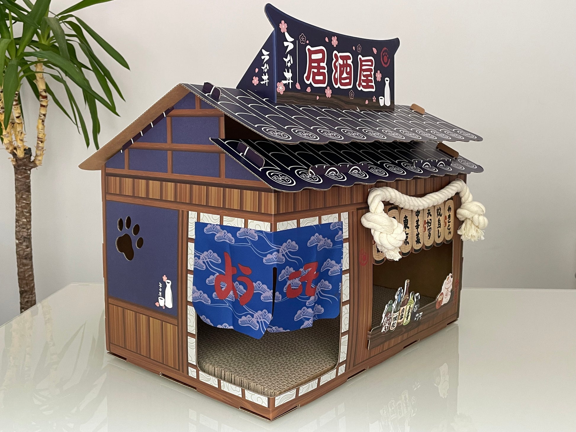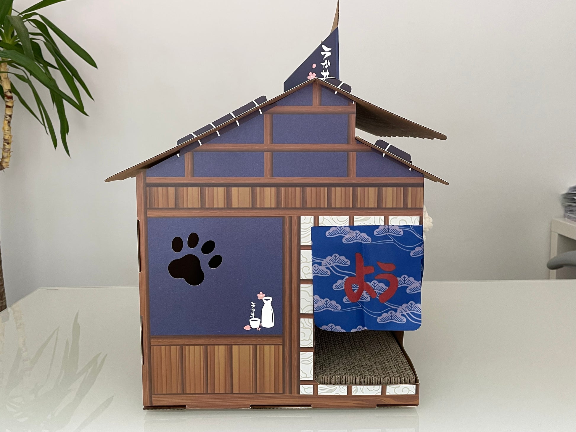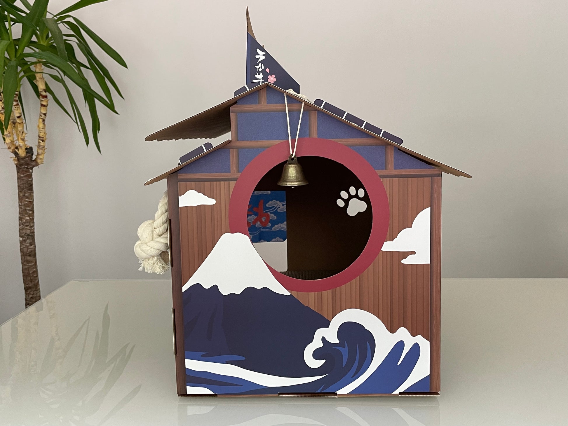 This Japanese-style cat house doubles as a quiet retreat and a scratch-ready throne — complete with curtain entrance, raised base, and serious charm.