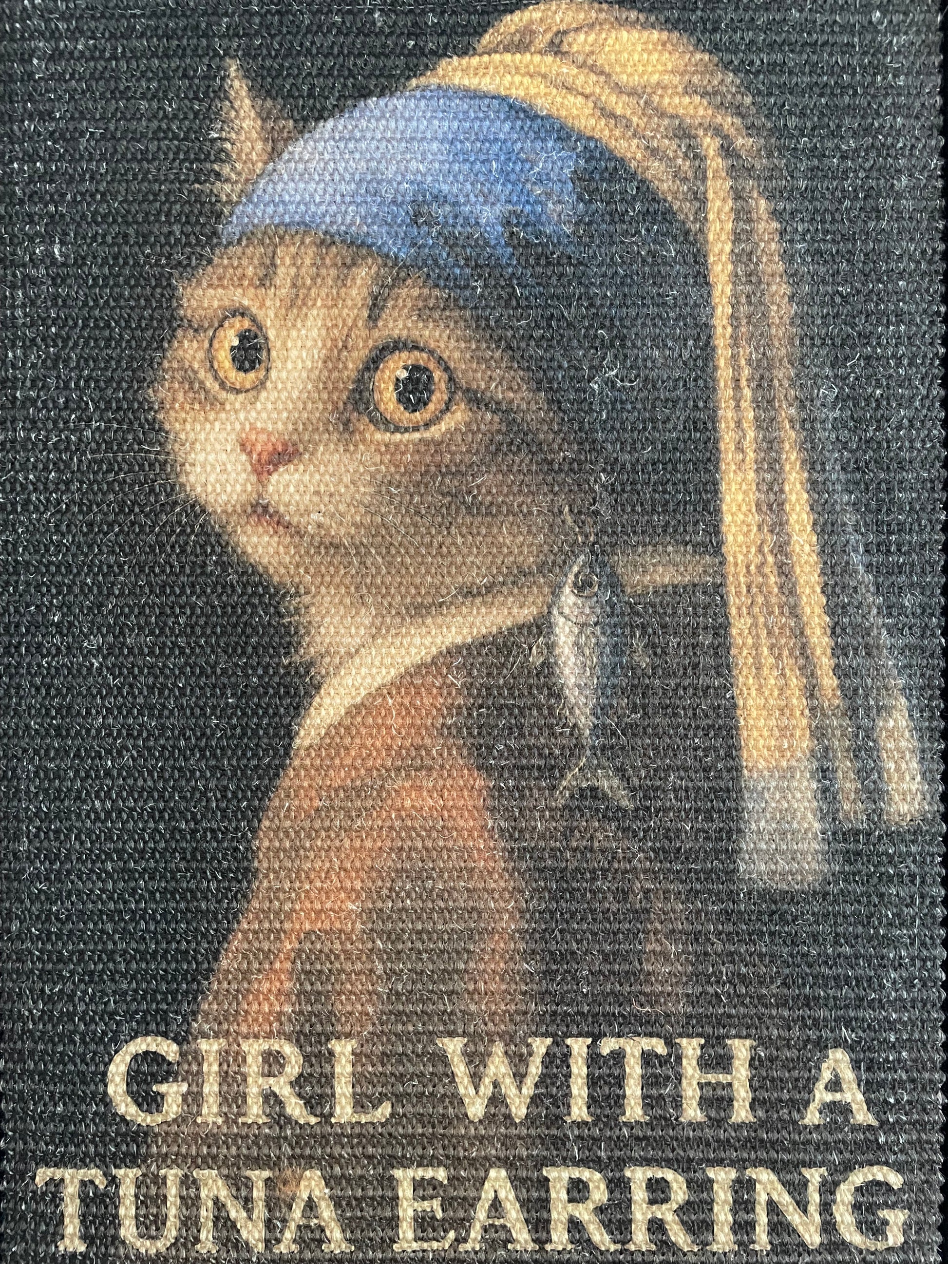 Unleash your cat’s inner art critic with this paw-some homage to classic portraiture — with a fishy twist! Inspired by the mysterious “Girl with a Pearl Earring,” our Tuna Mat features a classy kitty with an irresistible tuna dangling from her ear. A masterpiece of mischief and elegance, it’s the perfect blend of fine art and feline fun.