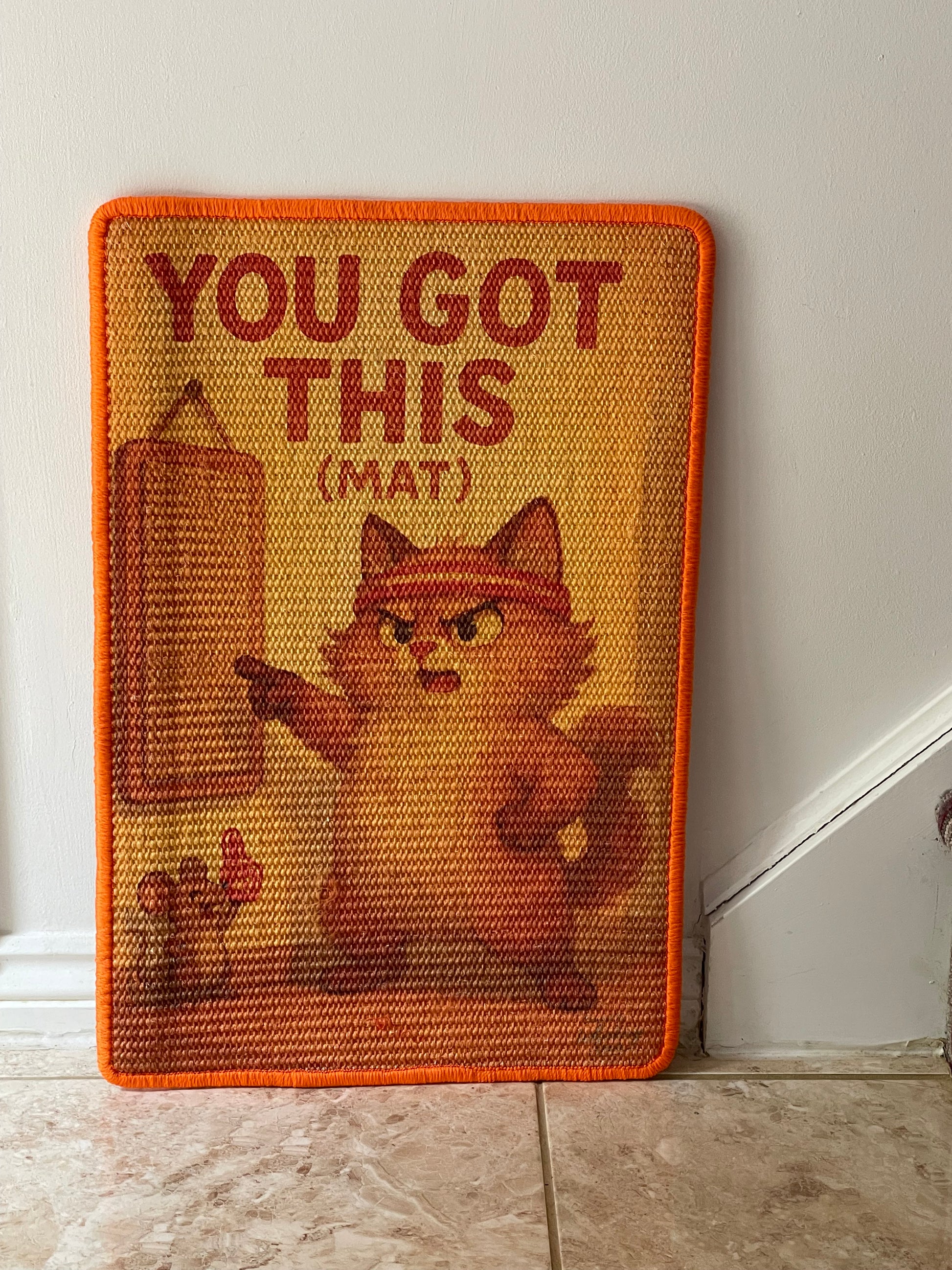 A daily dose of motivation for you and your cat! Our You Got This sisal scratching mat features a determined gym cat with a mirror reflection, reminding you both to stay strong.